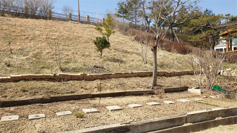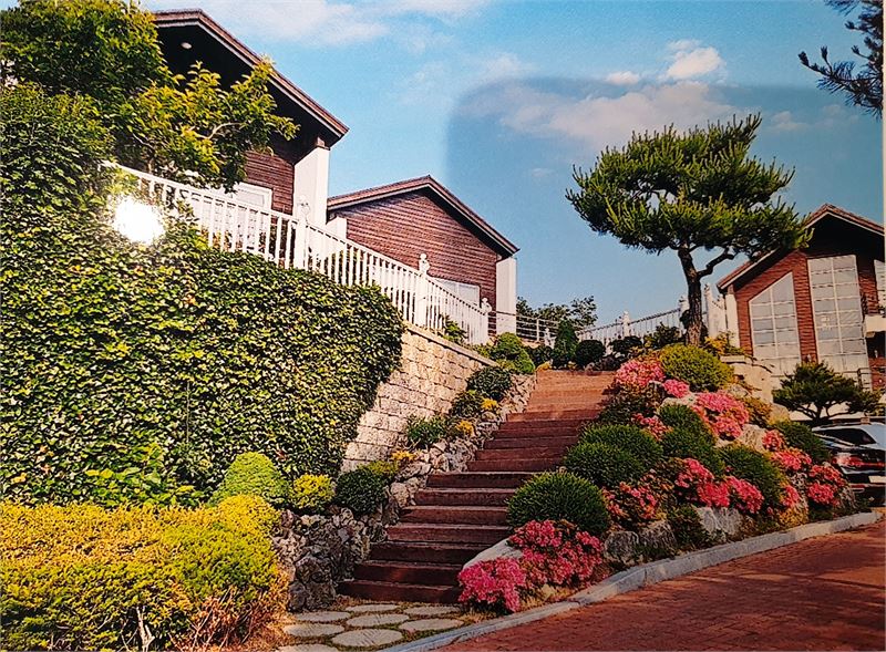 정원은 주차장 외벽은 석축으로 쌓았고 오르는 계단 옆으로는 값비싼 수입 화산석으로 정원까지 가꾸었으며 과실수(여러 종류)와 소나무가 심겨져 있으며 건물 오른편으로는 텃밭을 가꾸어 각종 채소류를 기를수 있도록 해놓았다.